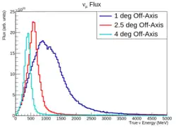 - ↑ L'énergie moyenne des neutrinos diminue quand l'angle par rapport au faisceau augmente.