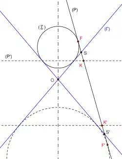 Cercle principal : c'est le cercle de diamètre [SS']. Foyer et directrice sont en relation pôle/polaire par rapport au cercle principal. Le cercle principal, privé de ses intersections avec les asymptotes, est également la podaire de l'hyperbole par rapport à l'un des foyers, c'est-à-dire le lieu des projetés orthogonaux de ce foyer sur les tangentes[18], ce qui fait de l'hyperbole, l'antipodaire de son cercle principal par rapport à un de ses foyers.