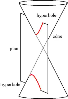 On considère un cône de révolution engendré par la rotation d'une droite () autour d'un axe () et on appelle l'angle géométrique entre ces deux droites. On prend d'autre part un plan dont la normale fait avec l'axe () un angle supérieur à . Si le plan ne passe pas par , il coupe le cône suivant une hyperbole. Si le plan passe par , il coupe le cône selon deux droites sécantes en .