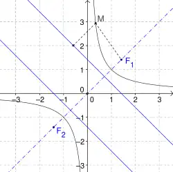 Une telle hyperbole possède en outre deux asymptotes passant par et par les points d'intersection du cercle principal et des directrices. Ces points sont également les projetés orthogonaux des foyers sur les asymptotes[1]. Lorsque les deux asymptotes sont perpendiculaires, on dit que l'hyperbole est « équilatère ».