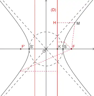 Cercle directeur : c'est un cercle passant par un foyer et de rayon égal à 2a. Selon la définition bifocale de l'hyperbole, l'hyperbole est le lieu des centres des cercles passant par F et tangents intérieurement ou extérieurement au cercle directeur de centre F'. L'ensemble des médiatrices des segments [FM], où M parcourt le cercle directeur de centre F' donne l'ensemble des tangentes à l'hyperbole, le cercle directeur est donc l'orthotomique de l'hyperbole par rapport à un foyer, c'est-à-dire l'ensemble des symétriques de F par rapport aux tangentes[18].