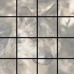 Une des opérations les plus courantes en traitement d'image consiste à utiliser un filtre linéaire, c'est-à-dire à appliquer une matrice de convolution. Pour bénéficier de l'architecture en hypercube, l'image doit être divisée en zones égales, et chaque zone assignée à un processeur. Mudge et Abdel-Rahman ont suggéré de considérer l'image comme étant une table de Karnaugh utilisant le code de Gray[D 13], ainsi que sur l'exemple ci-contre : si on considère une zone de l'image et ses coordonnées dans la table, alors on obtient directement le processeur auquel l'assigner. Par ailleurs, l'utilisation du code de Gray conserve l'adjacence : deux zones adjacentes dans l'image seront placées sur deux processeurs adjacents, sauf pour les coins. Le filtre, tel que celui de Sobel, est appliqué par chaque processeur à la zone qui lui est assignée. Si le filtre a besoin de certains pixels dépassant la zone disponible à un processeur, il peut la demander au processeur voisin en utilisant les propriétés d'adjacence ; pour des coûts plus faibles en communication, chaque processeur peut également avoir une zone de l'image dont la taille correspond à celle nécessaire pour le traitement plutôt qu'à une partition stricte.