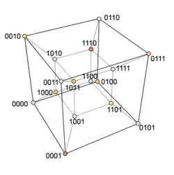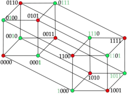 - Nombre chromatique. Un graphe est biparti si et seulement s'il ne contient pas de cycle impair, et il découle donc de la propriété précédente que l'hypercube est biparti. Un graphe biparti est celui pouvant être colorié avec deux couleurs, et ainsi le nombre chromatique de l'hypercube est . Pour voir qu'un graphe est biparti, il suffit de trouver un schéma afin de ranger chaque sommet dans un ensemble ou , de façon telle que tout sommet d'un ensemble ait comme voisins uniquement des sommets de l'autre ensemble. Dans le cas de l'hypercube[D 2], l'ensemble peut être constitué des sommets dont l'étiquette a un nombre pair de 1, et est l'ensemble de sommets dont l'étiquette a un nombre impair de 1. Un sommet étant connecté à tous ceux dont l'étiquette diffère exactement d'un symbole, il en découle que le nombre de 1 des voisins d'un sommet est soit supérieur soit inférieur : ainsi, un sommet pair sera connecté à des sommets impairs, et vice-versa.