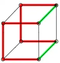 - Cycles. Par construction, le plus petit cycle correspond à , qui est isomorphe au cycle (i.e. le cycle de longueur 4). Le graphe est formé par deux graphes : si l'on souhaite un cycle de longueur supérieur à 4 dans , alors on choisit arêtes dans un des deux graphes , arêtes dans l'autre et 2 arêtes supplémentaires pour naviguer entre les deux graphes, ce qui porte le total d'arêtes à ; ce mécanisme est illustré dans la figure ci-contre avec un cycle de longueur 6, et permet de prouver que les cycles dans un hypercube sont toujours de longueur paire.