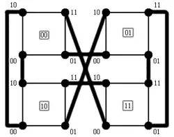 - Code de Gray[C 1]. Les étiquettes ordonnées des sommets dans un cycle hamiltonien sur définissent le code de Gray sur bits. De plus, ce code suit une construction similaire à celle de l'hypercube : les mots de bits sont déterminés en copiant les mots de puis en rajoutant 0 devant l'original, 1 devant la copie, et en inversant les mots de la copie.