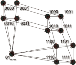 Dans les années 2000, de nombreux modèles furent proposés pour prendre en compte des caractéristiques communes à de nombreux réseaux. Deux des principales caractéristiques sont l'effet petit monde et l'effet libre d'échelle. Il est possible de modifier un hypercube afin d'obtenir l'effet libre d'échelle, tout en continuant à bénéficier de sa propriété de routage local[C 3]. Pour cela, des sommets sont contractés à la condition qu'ils ne diffèrent que sur une coordonnée qui sera remplacé par un joker « _ ». Après une séquence de contractions, c'est-à-dire plusieurs contractions successives, il est toujours possible de trouver un chemin d'un sommet à un sommet en utilisant leurs coordonnés et en remplaçant les jokers « _ » par les coordonnées de .