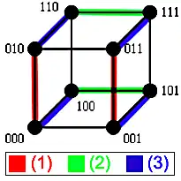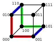 Les chemins entre deux sommets ont d'autres propriétés intéressantes, particulièrement pour les sous-graphes qu'ils définissent. Ainsi, l'union des chemins entre deux sommets distants de (i.e. différant de symboles) donne[A 2] l'hypercube . Ceci est illustré par l'exemple ci-dessous : dans le cas de deux sommets voisins et , il n'y a qu'un chemin et on obtient l'hypercube ; dans le cas où ils sont à distance 2, il y a deux chemins entre eux qui définissent , et s'ils sont à distance 3 alors l'union des chemins représente l'ensemble de l'hypercube .