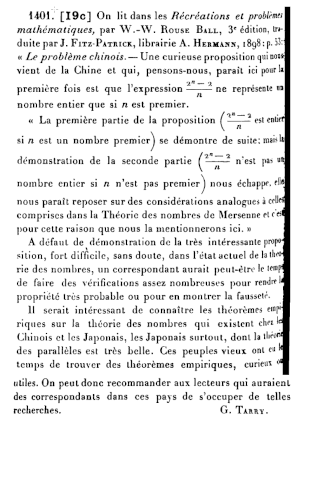 ) - ↑ (en) James H. Jeans, « The converse of Fermat's theorem », Messenger of Mathematics, no 27, , p. 174