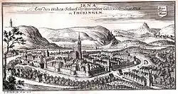 La création d'un présidial et d'une cour de justice en 1566, avec toute l'importance que cela eut pour l'application du droit en Thuringe, sont liées à ces événements. L'arrivée de l'imprimerie, qui gagna la région au début du XVIe siècle, est, elle aussi, liée à la création de l’université : au début du XVIIe siècle, Iéna tenait, pour le nombre de livres imprimés, la troisième place derrière Leipzig et Wittemberg[1]. Même après le partage de 1572, l’université demeura sous protection des Ernestins, alors que la ville était annexée au duché de Weimar.