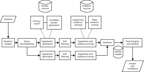 Le programme d'intelligence artificielle de Watson utilise le framework Hadoop pour parcourir une grande quantité de contenu disponible en local (deux cents millions de pages lors de sa victoire à Jeopardy!) très rapidement (en moins de trois secondes pour Jeopardy!)[11]. La question est transmise au programme par l'intermédiaire d'un fichier texte en même temps qu'elle est affichée pour les participants humains[9].