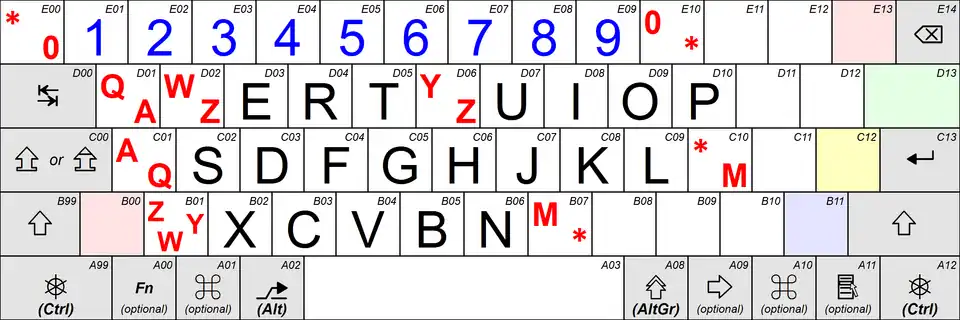 - zone alphanumérique : comprend les touches produisant des caractères et la barre d’espace, sauf la touche Tabulation et la touche Entrée (qui produisent des caractères au même titre que la barre d’espace mais qui ne sont pas comptées comme telles par la norme).