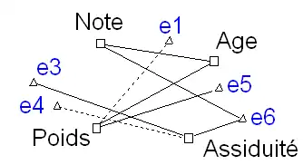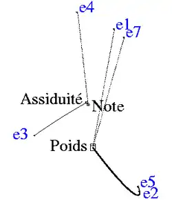 - Par rapport au schéma précédent, le lien entre note et assiduité a disparu, remplacé par les liens (Note,e6) et (Assiduité,e6) . Il était donc redondant : l’élève e6, très assidu et bien noté, explique à lui tout seul le lien (Note,Assiduité).