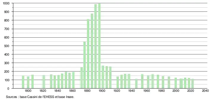 L'évolution du nombre d'habitants est connue à travers les recensements de la population effectués dans la commune depuis 1793. Pour les communes de moins de 10 000 habitants, une enquête de recensement portant sur toute la population est réalisée tous les cinq ans, les populations de référence des années intermédiaires étant quant à elles estimées par interpolation ou extrapolation[21]. Pour la commune, le premier recensement exhaustif entrant dans le cadre du nouveau dispositif a été réalisé en 2007[22].
