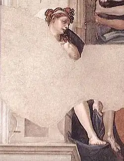 Dans son premier projet pour la voûte, Michel-Ange avait prévu de peindre des anges pour accompagner les figures des douze apôtres initialement envisagés. Les Ignudi, même dépourvus d'ailes, s'interprètent aussi comme les successeurs de ces anges (Emison, 1998). L'œuvre de Michel-Ange présente d'ailleurs des précédents montrant des êtres non ailés que leur ambivalence permet d'interpréter comme des anges, comme les figures à l'arrière-plan de la Vierge à l'escalier et les anges sans ailes de la Création d'Adam[1].
