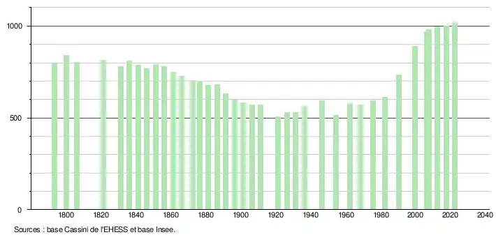 L'évolution du nombre d'habitants est connue à travers les recensements de la population effectués dans la commune depuis 1793. Pour les communes de moins de 10 000 habitants, une enquête de recensement portant sur toute la population est réalisée tous les cinq ans, les populations de référence des années intermédiaires étant quant à elles estimées par interpolation ou extrapolation[33]. Pour la commune, le premier recensement exhaustif entrant dans le cadre du nouveau dispositif a été réalisé en 2007[34].
