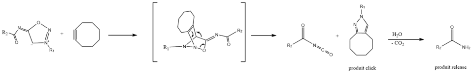La réaction SPICC strain-promoted iminosydnone−cycloalkyne cycloaddition se produit via un processus en deux étapes; deux composés d'intérêt sont formés de manière simultanée : un produit click et un produit release. L'iminosydnone réagit d'abord avec le cyclooctyne par une cycloaddition pour former un intermédiaire bicyclique qui subit une réaction rétro-Diels-Alder pour donner un pyrazole (produit click) et un isocyanate d'acyle qui est instantanément converti en l'amide terminal correspondant (produit release), par hydrolyse et décarboxylation[9].