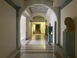 L’intérieur du rez-de-chaussée est remarquable par la qualité de ses espaces. L’entrée et ses larges dégagements distribuant les deux cages d’escalier bénéficient d’une mise en scène particulièrement monumentale et soignée. L’immense double porte de l’entrée principale en fer forgé et en verre donne sur un escalier menant à l’entre-sol. Des supports en maçonnerie pour recevoir des vases en céramique, des sculptures avec un buste de Vercingétorix et du général Desaix du sculpteur Raymond Coulon[5], un dallage en marbre, l’éclairage zénithal filtré par des pavés de verre translucides de couleurs sont autant de détails qui prouvent le faste du traitement de l’entrée de l’immeuble Dalmas[6]. Digne d’un hôtel de par ses dimensions, le hall est recouvert d’encadrements de marbre peints bleus en trompe-l’œil sur les murs, toujours dans l’idée et l’envie de créer une atmosphère résolument luxueuse. Ce hall d’entrée occulte les coulisses du personnel de maison puisque deux portes en face de la grande porte d’entrée mènent aux escaliers de service, aux caves et à l’actuelle loge du gardien. Un autre accès au hall est possible depuis la place Sugny.