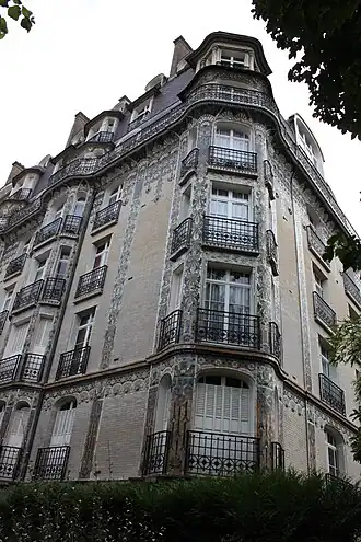 L'ossature en béton armé avec remplissage de briques est recouverte de motifs de grès flammés créés par le céramiste Alexandre Bigot dont c'est la dernière œuvre. Ils protègent les façades et recouvrent les points forts du bâtiment : les bow-windows de la façade nord, la porte d'entrée et le balcon du cinquième étage par un décor de palmettes, rosettes et guirlandes dont les couleurs se sont un peu ternies[2].