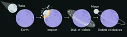 Selon l'hypothèse de référence, il y a 4,468 milliards d'années — soit environ 100 millions d'années après la formation de la Terre —, le planétoïde Théia, de la taille de Mars, soit 6 500 kilomètres de diamètre, aurait heurté la Terre à la vitesse de 40 000 kilomètres par heure sous un angle oblique. Le choc aurait détruit l'impacteur dont les restes, ainsi qu'une portion du manteau terrestre, auraient été éjectés dans l'espace, en orbite autour de la Terre. Environ 2 % de la masse originelle de l'impacteur aurait produit un anneau de débris en orbite. Par accrétion, entre un et cent ans après l'impact, la moitié de ces débris aurait donné naissance à la Lune[19],[20]. Pour la Terre, cet impact a eu plusieurs conséquences :