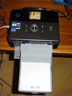 Le chargeur contient des feuilles de papier spécial d'un format déterminé (généralement 10 × 15 cm). Un rouleau les déplace afin que leur surface passe progressivement sous la tête d'impression. L'impression s'effectue en quatre passes : trois pour les couleurs, puis une pour le vernis protecteur. Le papier utilisé peut résister à des températures élevées sans noircir ou se tordre, et sa surface est traitée pour fixer les couleurs à l'état gazeux. Il faut environ une minute pour imprimer une photo.