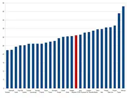 Les inégalités de revenu diffèrent grandement entre les pays, même dans le cas des seuls pays développés. Ainsi, à la fin des années 1980, le rapport interdécile était de 2,7 en Suède contre 5,9 aux États-Unis[30]. L'OCDE fournit des données plus récentes, construites à partir du coefficient de Gini, qui nous permettent de dresser une typologie des pays en fonction de l'importance de l'inégalité de revenu qui y prévaut. Le coefficient vaut 100 dans le cas d'une société parfaitement inégalitaire (une personne a tous les revenus), et 0 dans le cas contraire.