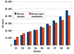 Les ressources économiques que reçoit un individu au cours d'une période donnée, et qui constituent son revenu, jouent un rôle central dans les inégalités économiques. Ces inégalités se constituent au moment de la distribution primaire des revenus, avant l'action de l'État : revenus d'activité, et en particulier salaires, ainsi que revenus provenant du patrimoine. Ces inégalités peuvent être en partie corrigées par le système de redistribution étatique : les prélèvements obligatoires pèsent surtout sur les plus riches tandis que les prestations sociales bénéficient prioritairement aux plus pauvres. Ainsi comme le montre le diagramme ci-contre, le revenu en dessous duquel vivent les 10 % des ménages français les plus pauvres (premier décile) était de 7 200 euros en 2024. Après redistribution, il était de 11 400 euros, soit un revenu supérieur de 60 %. Au contraire, le seuil au-dessus duquel vivaient les 10 % des ménages français les plus riches (décile 9) (40 733 euros) était diminué de 14 % après redistribution et taxation.