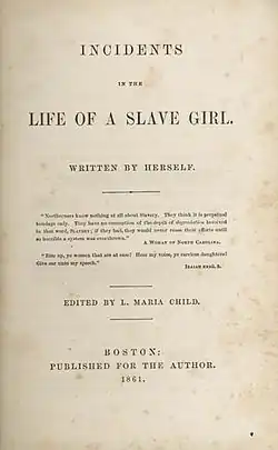 Incidents in the Life of a Slave Girl, ou Incidents dans la vie d'une jeune esclave en français, est une autobiographie écrit par une jeune mère fugitive et publié en 1861 par Lydia Maria Child pour son auteur, Harriet Jacobs (qui utilise pour l'occasion le pseudonyme de Linda Brent. Le livre raconte la vie d'esclave de Harriet Jacobs et la façon dont elle a gagné sa liberté pour elle-même et pour ses enfants. Elle a contribué au genre du récit d'esclave en utilisant les techniques des romans sentimentaux "pour parler des problèmes raciaux et sexuels"[1]. Elle explore les luttes et les abus sexuels que les femmes esclaves subissent, ainsi que leurs efforts pour réussir leur maternité et protéger leurs enfants lorsqu'ils pourraient être vendus.