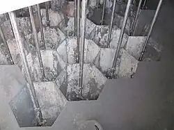 Intérieur d'un précipitateur électrostatique ; les tiges (électrodes coronales) sont négatives, alors que les plaques en forme de nids d'abeilles sont chargés positivement