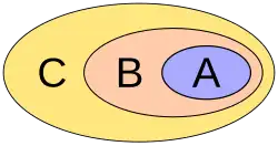 Pour trois ensembles quelconques A, B et C, si A est un sous-ensemble de B et B est un sous-ensemble de C, alors A est un sous-ensemble de C, c'est-à-dire que :