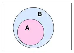 Soient deux ensembles A et B. Par définition, A est inclus (au sens large) dans B si tout élément de A est un élément de B, A est inclus (au sens strict) dans B si de plus A ≠ B.