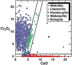 - ↑ (en) Herman S. Grütter, John J. Gurney, Andrew H. Menzies et Ferdi Winter, « An updated classification scheme for mantle-derived garnet, for use by diamond explorers », Lithos, selected Papers from the Eighth International Kimberlite Conference. Volume 2: The J. Barry Hawthorne Volume, vol. 77, no 1, , p. 841–857 (ISSN 0024-4937, DOI 10.1016/j.lithos.2004.04.012, Bibcode 2004Litho..77..841G, lire en ligne)