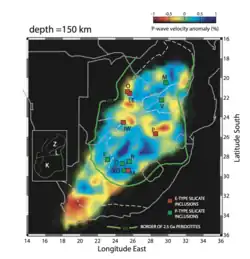 Dans la lithosphère cratonique du craton du Kaapvaal au Zimbabwe, la vitesse sismique à 150 km de profondeur correspond à celles des inclusions retrouvées dans les diamants, qu'elles soient péridotitiques ou éclogitiques. Cela suggère que les vitesses des ondes P se propageant au sein de la lithosphère pourraient être utilisées pour cartographier la répartition des différentes régions sources de diamants[9].