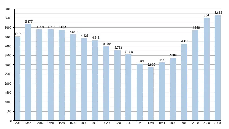 Les chiffres des années 1831 à 1970 tiennent compte des chiffres des anciennes communes fusionnées.