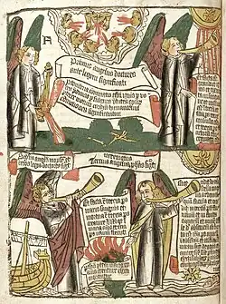 - ApocalypseContenant des scènes et des textes de l'Apocalypse et de la vie apocryphe de Saint Jean[19] (plusieurs exemplaires conservés à la Cambridge Digital Library (en)[20] et à la Bayerische Staatsbibliothek[21]).