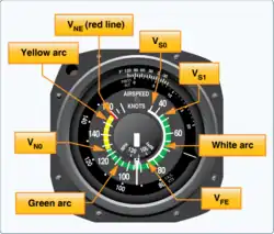 Ensuite, il y a les arcs, l'arc vert est compris entre Vs1 et VNO correspond à l'utilisation normalle de l'appareil. L'arc Jaune commence à la VNO et se termine à la VNE . Le pointeur ne doit pas se situer dans cet arc lors d'atmosphère turbulente, l'appareil pourrait subir des dégâts (déformation permanente). En cas de dépassement de la VNE l'appareil serait en situation de survitesse et les risques de dégâts sont très élevés (flutter, détachement).