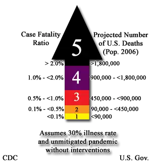 Les niveaux de « catégorie » ont été introduits pour fournir une analogie compréhensible avec les schémas de classification des ouragans, en référence spécifique aux conséquences de l'ouragan Katrina. Comme l'échelle des ouragans de Saffir-Simpson, l'IGP varie de 1 à 5. Les pandémies de catégorie 1 sont les plus bénignes (équivalentes à la grippe saisonnière) et le niveau 5 est réservé aux pandémies les plus graves présentant le pire scénario (comme les pandémies de 1918 de grippe espagnole)[3].