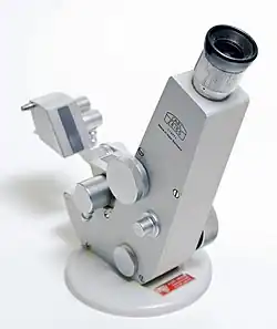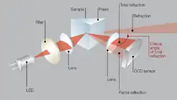 Pour les liquides le réfractomètre le plus utilisé est le réfractomètre d'Abbe basé sur le principe de la mesure de l'angle de réfraction limite et permettant d'atteindre des précisions de l'ordre de ± 0,000 2[39],[40].