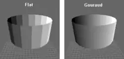 - Illumination face par face : La normale de la face est calculée en fonction de la position de ses sommets dans l'espace. À partir de cette normale, et des propriétés de la surface, on additionne la lumière ambiante, ainsi que la réflexion (diffuse et spéculaire) des lumières projetées par les sources lumineuses. Cela permet d'avoir un rendu relativement réaliste avec peu de calcul. Il est possible d'augmenter à certains endroits les faces pour un rendu plus précis.