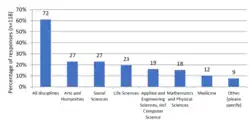 Les infrastructures de science ouverte bénéficient à un ensemble disparate de disciplines et de communautés scientifiques. En 2020, 72 % des infrastructures européennes étudiées par Sparc Europe déclaraient servir toutes les disciplines. Les sciences humaines et sociales étaient les plus citées, notamment parce que l’enquête était « largement diffusée par le réseau OPERAS[96]. » En 2010, les infrastructures travaillant dans ces domaines étaient beaucoup moins répandues. La plupart des utilisateurs intervenaient dans « les biosciences, la physique des particules et d’autres secteurs de la physique, des sciences de la terre et de l’environnement, de l’informatique, de l’astronomie et de l’astrophysique[97]. »