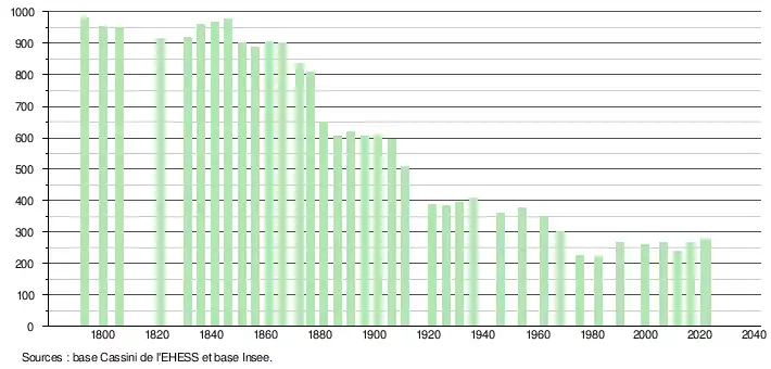 L'évolution du nombre d'habitants est connue à travers les recensements de la population effectués dans la commune depuis 1793. Pour les communes de moins de 10 000 habitants, une enquête de recensement portant sur toute la population est réalisée tous les cinq ans, les populations de référence des années intermédiaires étant quant à elles estimées par interpolation ou extrapolation[21]. Pour la commune, le premier recensement exhaustif entrant dans le cadre du nouveau dispositif a été réalisé en 2006[22].