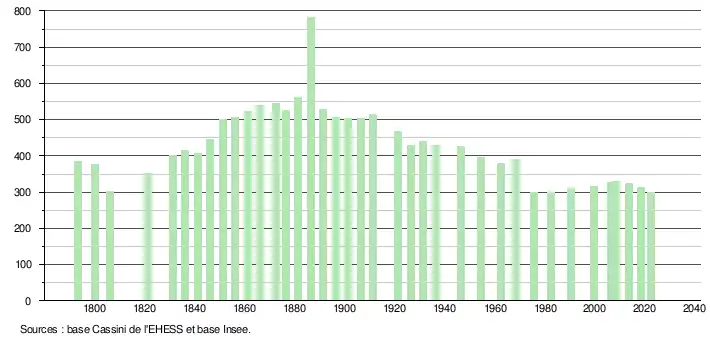 L'évolution du nombre d'habitants est connue à travers les recensements de la population effectués dans la commune depuis 1793. Pour les communes de moins de 10 000 habitants, une enquête de recensement portant sur toute la population est réalisée tous les cinq ans, les populations de référence des années intermédiaires étant quant à elles estimées par interpolation ou extrapolation[33]. Pour la commune, le premier recensement exhaustif entrant dans le cadre du nouveau dispositif a été réalisé en 2008[34].