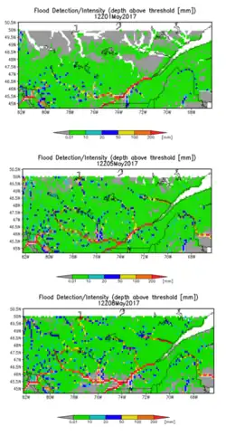 Les cartes à gauche montrent la progression entre le 1er et le de la zone inondée telle quelle détectée par satellite. En bleu, les zones en inondations mineures et en rouge celles en débordement majeur. Elles montrent la progression des inondations le long des grands cours d'eau du Québec : la rivière des Outaouais, le fleuve Saint-Laurent, la rivière Saint-Maurice, la rivière Saguenay, etc.