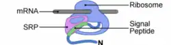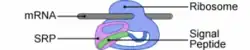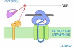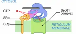Le PS reconnu, la protéine est adressée à la membrane. Chez les mammifères, SRP est reconnue par SR (SRP Receptor), un récepteur membranaire du réticulum. L'interaction SRP-SR est régulée par le GTP. La fixation de GTP sur SRP54 permet la dissociation de SRP et du PS[1]. La fixation d'un GTP sur la sous-unité SRα stabilise l'ancrage SRP-SR. La déstabilisation du complexe SRP-PS est compensée par l'ancrage du ribosome (par sa grande sous-unité) au complexe de translocation, ou translocon.