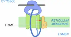 À ce stade, le ribosome est fortement lié au translocon. Le peptide signal se retrouve en contact avec le translocon et TRAM (Translocating Chain Associating Membrane protein), une glycoprotéine satellite du complexe de translocation. TRAM n'est pas systématiquement requise lors de la translocation. Elle semble tout de même souvent nécessaire à l'insertion des protéines membranaires. Le contact entre le PS et TRAM est possible grâce à une ouverture du canal formé par Sec61 sur la périphérie du translocon.