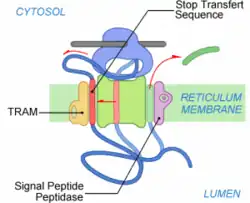 La synthèse du polypeptide continue. Elle est co-traductionnelle car elle se déroule simultanément avec la traduction. Le polypeptide est transféré à travers la membrane au fur et à mesure de son élongation jusqu'à la synthèse d'une séquence hydrophobe particulière qui bloque le transfert du polypeptide. Cette séquence est appelée Signal d'Arrêt de Transfert (SAT). Le SAT est composé d'une vingtaine de résidus hydrophobes. Grâce à son hydrophobie il suit le même chemin que le peptide signal et se retrouve en périphérie du complexe de translocation, probablement en contact avec TRAM[2],[3]. Cette translation est possible grâce à une ouverture latérale du translocon.
