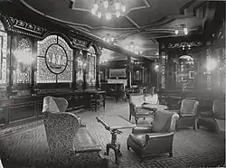 Les passagers de première classe bénéficient d'un fumoir de type géorgien à l'arrière du pont A. Selon les convenances de l'époque, seuls les hommes y ont accès[16]. Afin de reproduire l'ambiance des clubs masculins du continent, il est décoré de boiseries en acajou sombre incrustées de nacre, et est orné de nombreux vitraux et d'alcôves[a 32]. Le sol est garni de carreaux de linoléum bleus et rouges. Au centre du mur le plus à l'arrière se trouve une cheminée surmontée d'un tableau de Norman Wilkinson représentant L'Approche du port de Plymouth. Cette cheminée est la seule à bord dans laquelle soit entretenu un véritable feu, les autres fonctionnant à l'électricité[a 33]. Le mobilier est tapissé de cuir, dont la couleur est indéterminée (probablement vert ou bordeaux)[a 34].