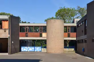 Les acrotères de l’école et du semi internat sont faits également en béton brut de décoffrage, mais à l’aide de coffrages lisses. Ceci permet de finir proprement le haut des bâtiments. Sur les murs qui ne présentent pas ce détail constructif, on observe que le haut de la brique est subtilement fini à l’aide d’un bandeau de béton de quelques centimètres seulement. Les linteaux de fenêtre sont aussi soulignés d’un liseré en béton.