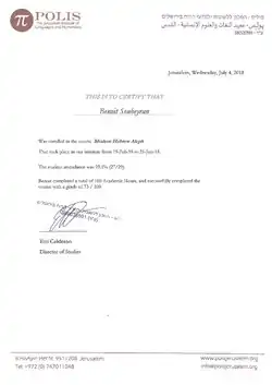 - ↑ (en) « MA in Near Eastern Languages », sur polisjerusalem.org (consulté le ).