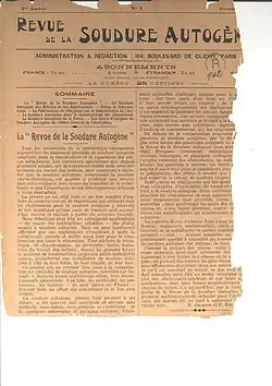 En 1909, la Revue de la soudure autogène est créée et diffusée dès son premier numéro à 15 000 exemplaires[52]. C'est la première publication à être entièrement consacrée à la vulgarisation des procédés de soudure autogène. Ses rédacteurs en chef en sont Raphaël Granjon et Pierre Rosemberg. Elle est destinée aux industriels, aux ingénieurs, aux contremaîtres et aux chefs d'atelier.