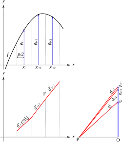 Considérant le même découpage que précédemment, on découpe l'intervalle d'intégration en bandes verticales de largeur p centrées sur les valeurs xi. Sur un graphique voisin, le graphique polaire, on place des vecteurs à l'origine O et l'on considère un point P sur l'axe des x, distant de O ; P est appelé le pôle. Si l'on relie P aux extrémités des vecteurs, on obtient des droites di dites polaires, dont les coefficients directeurs ai sont proportionnels aux valeurs de f(xi ) :